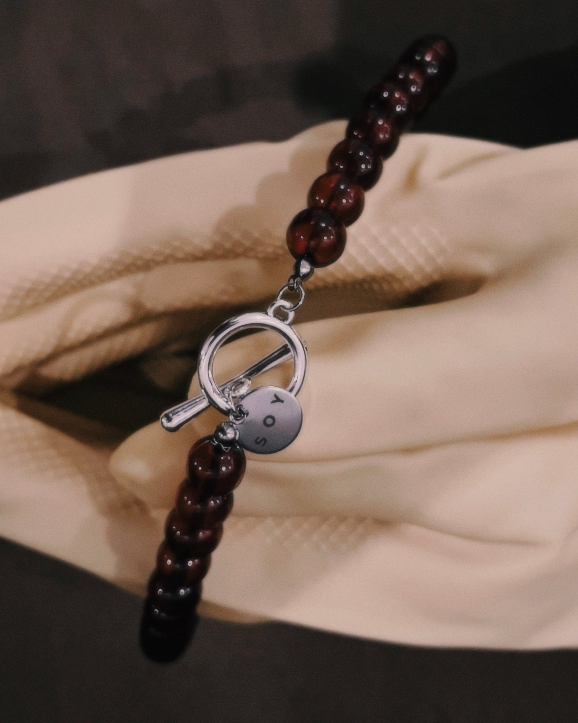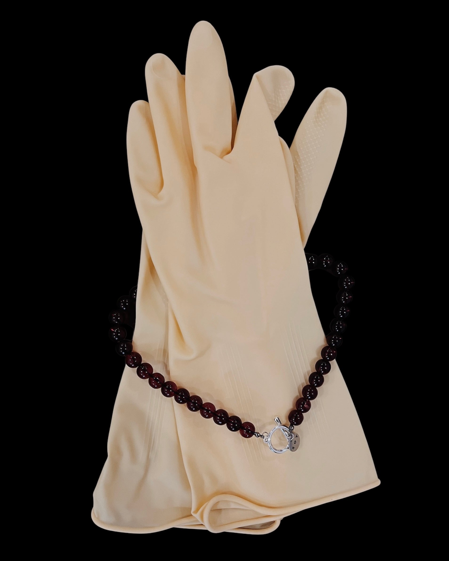 A delicate line of red glass beads. Light plays along its surface; a quiet glimmer, a passing chime. Simple by design. Singular in feeling.